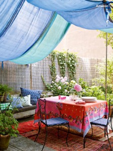 Romantic and enchanting – this beautiful set-up can easily be achieved by draping a lightweight fabric over bamboo poles. Pick pretty opaque fabrics and you’ll cast gently diffused sunlight onto your seating area. What’s more, this wonderful setting would make the perfect party spot, particularly with fairy lights strung up under the billowing fabric.